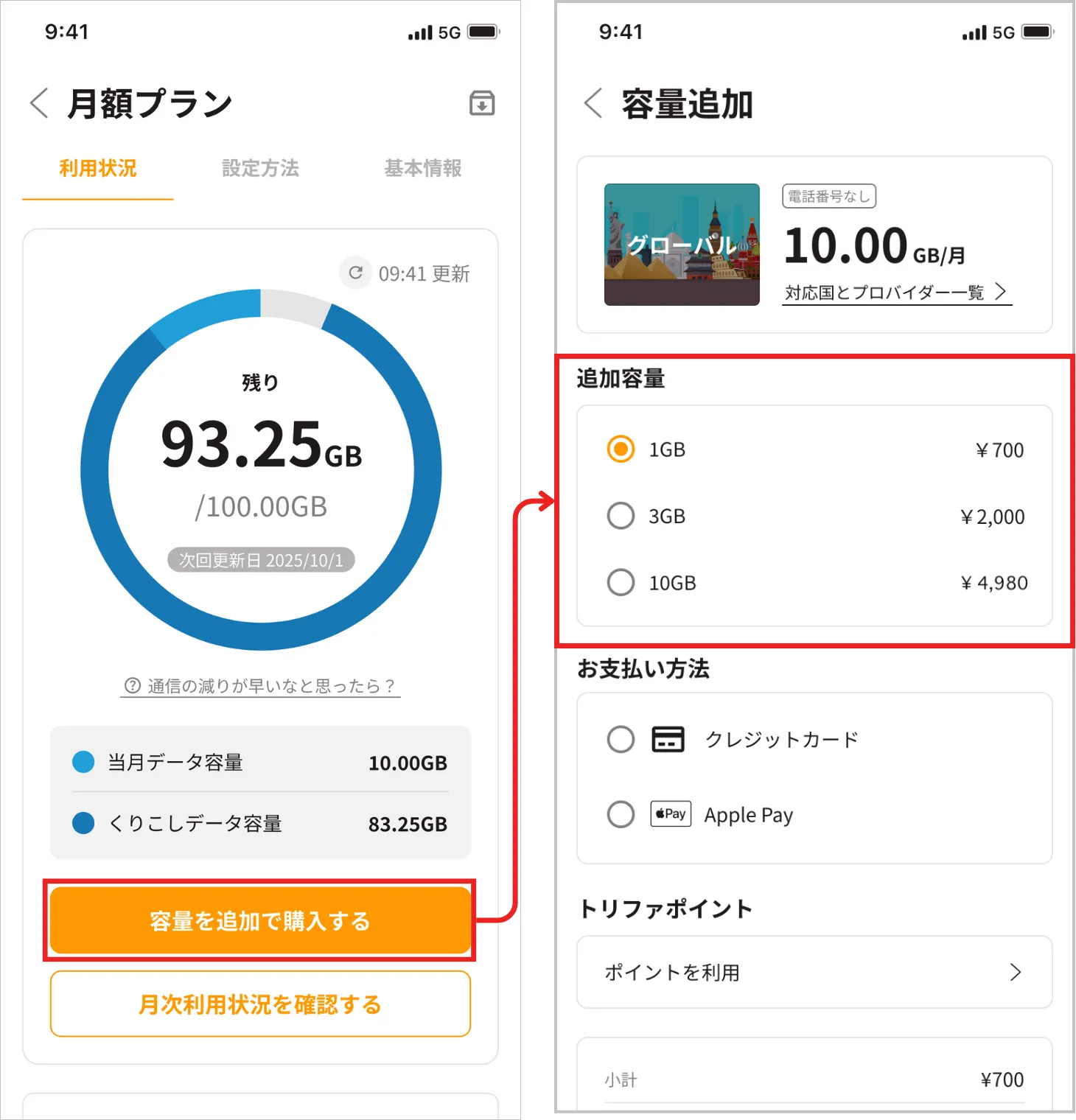 - 「利用状況」をタップし、「容量を追加で購入する」を選択