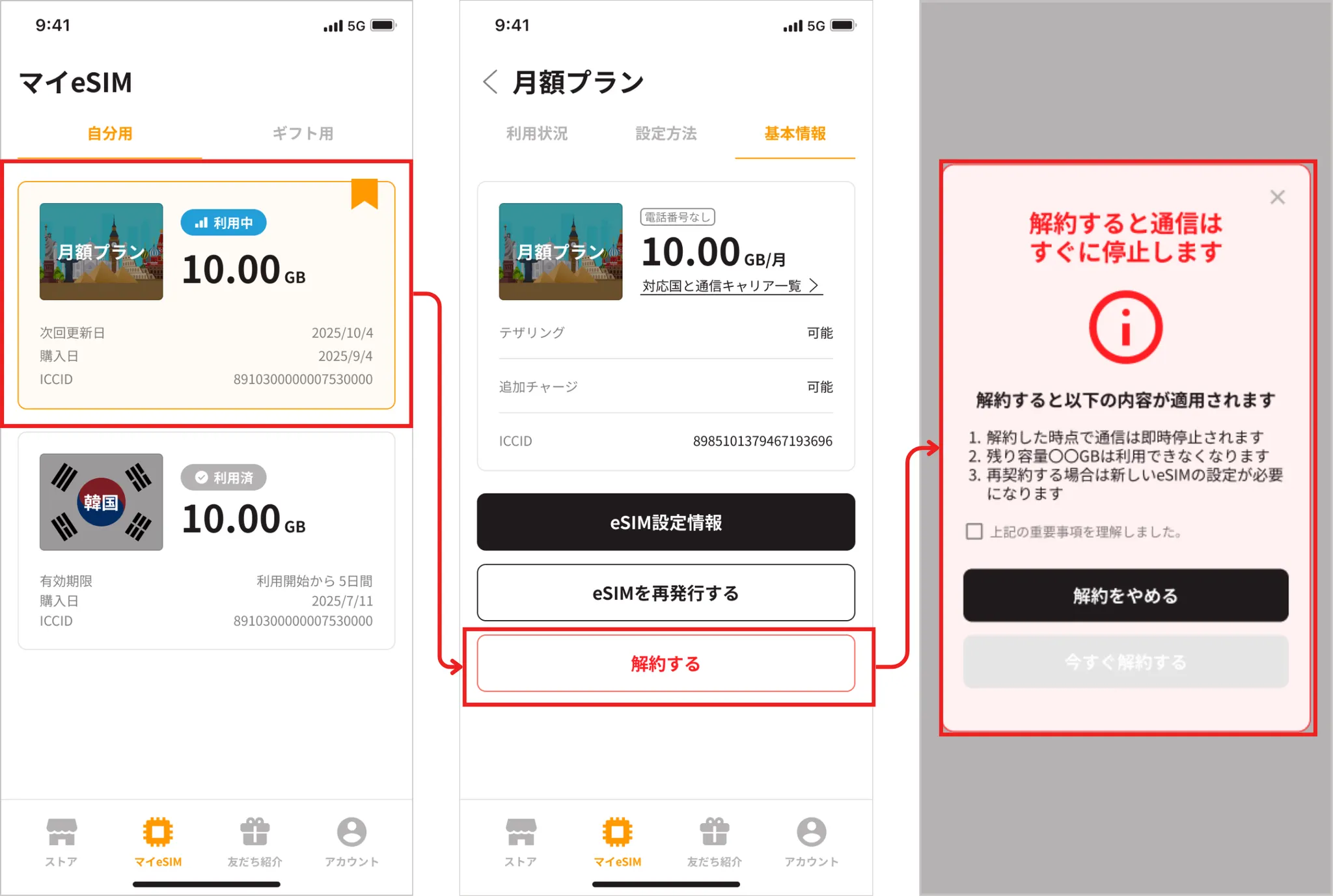 - マイeSIMをタップし、解約を行う月額プランを選択