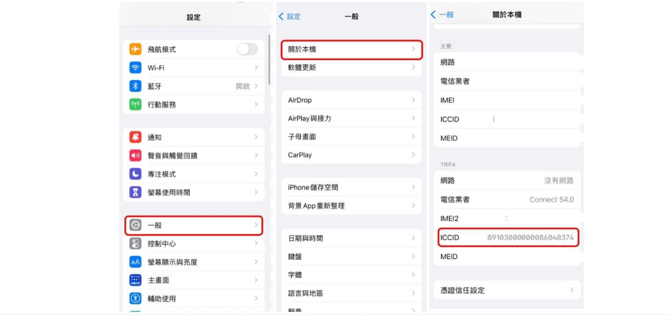 6. iPhone的設定→「一般」→「關於本機」,向下捲動,檢查和步驟5出現的「ICCID」是否為一致